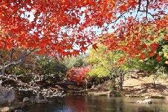 徳川家康が築き、天下統一への足がかりとなった出世城として名高い浜松城では、天守閣を囲むようにヤマモミジやアカシデなどの木々が赤く色づきます。城内には若き日の家康の石像があるほか、浜松城公園の北側には池や小さな滝を配置した日本庭園もあり、風情ある景色を見ることができます。