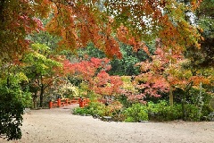 日本三景のひとつに数えられる景勝地、宮島にあり、その名の通り紅葉の名所として知られる紅葉谷公園では、例年11月中旬になると美しい紅葉が見頃となります。天然記念物に指定されている弥山原始林の麓に位置し、イロハカエデをはじめとして、オオモミジ、ウリハダカエデ、ヤマモミジなどが赤や黄金色に色づきます。紅葉の見頃にあわせて、夜間ライトアップも行われます。嚴島神社、紅葉谷公園で秋の宮島を満喫できます。