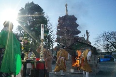 川崎大師の一年最後のご縁日として、その年ご利益をいただいたお護摩札やお守りに感謝するお焚き上げ法楽が、境内特設道場で執り行われます。厄除けをはじめ、家内安全、商売繁昌、交通安全などのご利益に感謝し、多くの人々が参詣します。
