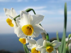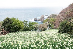 日本水仙三大群生地のひとつとして知られる越前海岸では、例年12月から2月にかけて水仙の花が見頃を迎えます。青い空と青い海、緑の葉に、可憐な白い花のコントラストが、見渡す限りの大パノラマに広がり、訪れる人たちの目を楽しませます。越前海岸で咲く日本水仙は「越前水仙」の名で知られ、福井県の花と越前町の花にも指定されています。梨子ヶ平園地や越前岬水仙ランドが、観賞スポットとしても有名です。