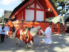 宮廷の行事が伝わったとされる「白馬(あおうま)神事」は、一年の初めに白馬を見れば、その年は無病息災といわれる神事です。祝詞奏上の後、奉行2人と神馬舎人が神馬に付き添い、各本殿を巡拝します。次に駆足で第一本殿の周りを2周し、最後に各本殿の外周を一巡りして第一本殿に至り、拝礼して退出します。