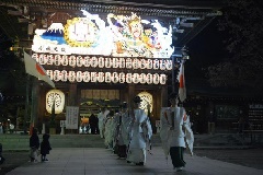 全国唯一の八方除・方位除の守護神として信仰される寒川神社の追儺神事は、日が沈んだ午後8時頃、境内すべての灯火を消した浄闇の中で行われます。年頭にあたり、すべての邪気災厄を祓い除く神事が、古式に則り斎行されます。神事終了後、御神前に供えられた弓矢が、災難除のお守りとして参拝者に授与されます。