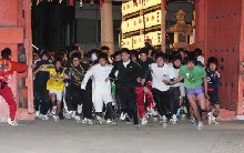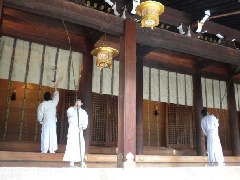 新しい年を迎えるにあたり、西宮神社では、一年間の本殿のほこりを落とす、年末恒例の煤払いが行われます。午前10時から本殿で今年の無事安泰に感謝する祝詞(のりと)をあげた後、神職が白衣袴に覆面姿で長さ約4mの笹竹の特製のはたきなどを用い、本殿内部をはじめ、普段は掃き清められない天井近くの柱や壁などのほこりも落とします。