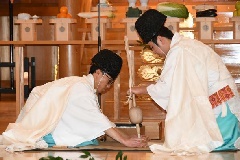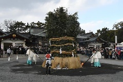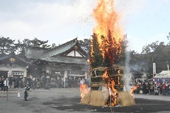 古いお守りやお札、破魔矢などの縁起物を高く積み上げてお焚き上げする「とんど祭」が、毎年1月15日に広島護国神社で行われます。火鑚(ひきり)神事できり出された忌火がとんどに点火され、巨大な炎となります。とんどで焼いた餅を食べると、一年間病気にならないという言い伝えがあり、炎が落ち着いた頃から、正月に供えられた鏡餅が焼かれて、参拝者にふるまわれます。その年の無病息災を願い、境内は多くの参拝者で賑わいます。※古いお守りやお札などは1月14日まで受付