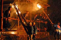 「取り追うまつり」は師走の火祭りで、毎年12月最初の卯の日の前夜に行われます。祭場では、「打ーちゃえんかー」と叫ぶ攻め手が、御供さんが入った笊(ざる)を奪って蓋を開けようとするのを、3本の大松明と33本の小松明を持った守り手が「押ーしゃえんかー」と叫びながら、松明の火の粉をあびせて立ちはだかり、激しい松明合戦が繰り広げられます。笊の奪い合いの後、笊の中の御供は氏子や見物客に配られます。