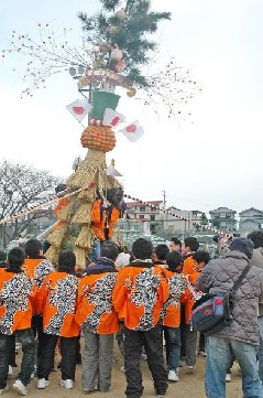 お正月に迎えた神様を天に返す行事とされる「とんど焼き」が、山波小学校で行われます。青竹などを用いて作った「とんど」と呼ばれるわら細工の飾りを、男性や児童が担ぎ、囃子にあわせて練り歩きます。その後、「とんど」に火がつくと、無病息災や豊作などを祈り、しめ飾りなどが燃やされます。尾道市の民俗文化財に指定されています。