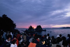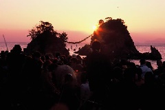 日豊海岸国定公園内にある豊後二見ヶ浦から、初日の出が望めます。長さ日本一、重さ2tともいわれるしめ縄で、男岩と女岩を結んだ夫婦岩が有名です。年末から年始にかけてライトアップが行われ、元日は午前5時から、しめ縄に使われたワラが入ったお守りが販売されます。午前6時30分頃からは「ニューイヤー花火」が実施され、約1000発の花火が打ち上げられます。