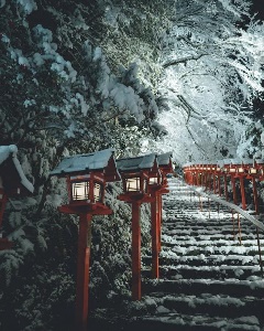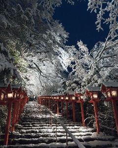 貴船神社では、大晦日は17時に閉門の後、22時に再び開門されます。授与所受付が再開され、新年にかけて終夜参拝可能となります。丹塗りの鏑矢に「水まもり」がついた『水蓬莱(みずほうらい)』は、1月いっぱいまでの期間限定で授与されます。<※駐車場はほとんどありません。気候により路面凍結の恐れがあるため、公共交通機関の利用をおすすめします。>
