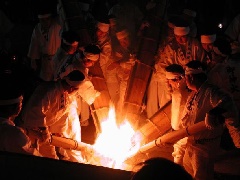 国家安泰と国民の平安を祈る伝統行事「繞道祭」が、大神神社で行われます。ご神火を先入道・後入道と呼ばれる大松明に移し、これを氏子がかついで山麓に鎮座する摂末社19社に巡拝します。その後、ご神火が拝戴所に移されると、参拝客は持参の火縄やカイロ、ランタンなどに火を移し取り、家庭に持ち帰ることができます。