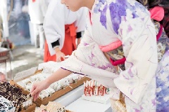 日本書紀にも記述があり、1700年以上の歴史を有する丹生都比売神社の初詣では、室町時代造営の重要文化財である楼門内へ進み、祈祷や金幣祓を受けることができます。破魔矢や干支物など新年の干支物は、幸先詣(12月1日より)から節分過ぎまで授与されます。空海を白と黒のご神犬が導いたとの伝承から、この導き犬にちなんだおみくじやお守りも人気です。※山中の盆地で冬季は冷え込む地域のため、車両は冬用タイヤの着用を推奨。