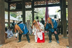相楽神社では、毎年1月15日に稲作の過程を表わす儀式として「御田」が行われます。宮司による修祓、祝詞の後、所作を担う太夫を含む4人の宮守と巫女による祝詞に始まり、鍬初め、鋤初め、肥打ち、苗代しめ、種まき、春田打ち、田植えまでの過程が演じられます。古風な種まき、春田打ち、田植の歌を後世に残す貴重な伝承芸能とされ、「相楽の御田と正月行事」の名称で、京都府の無形民俗文化財に指定されています。