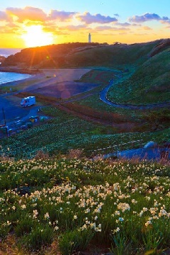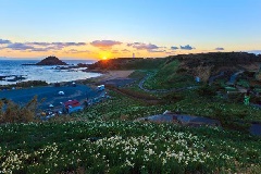約300万本もの水仙の甘い香りが漂う、須崎半島の爪木崎から、初日の出が望めます。冬でも温暖なため、コバルトブルーの海から昇る太陽をゆっくりと眺めることができます。<※初日の出の時刻にバスの運行はありません。>