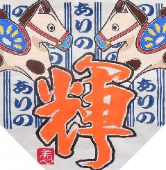 新成人を祝い、縦5m、横4.8mの「20畳敷東近江大凧」が、聖徳中学校グランドで揚げられます。東近江の大凧は、祝い凧や祈願凧であるため、「判じもん」と呼ばれる絵柄が描かれているのが特徴です。令和8年(2026年)の大凧の絵柄は、午(うま)年にちなんで、上部に午の張り子を左右に配置し、下部に「輝」の文字、背景に「ありの」と書かれた手ぬぐいが描かれており、「ありのまま(馬馬)輝け」と読ませます。