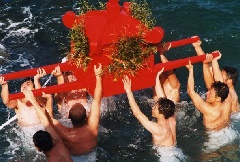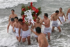 約400年前、上津深江地区に悪病が流行した際、山伏が海で禊をして病魔を退散させたのが始まりとされるお祭りです。神事の後、ほら貝の合図でさらしをまいた男衆約30人が、神輿を担いだまま冷たい海に飛び込みます。威勢良く「ヨイヤ、ヨイヤ」とかけ声を上げ、ほら貝を吹き鳴らしながら海岸沿いを泳いだ後、氏子の家々を土足のまま駆け上がり、玄関や縁側、座敷で神輿になますを載せてお神酒をかけ、一年間の無病息災を祈ります。
