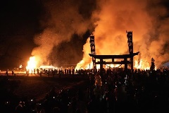 百済王族伝説の証とされ、1300年もの長きに渡り守り継がれてきた「師走祭り」が、神門神社周辺で行われます。木城町の比木神社に祀られる福智王(子)が、約90km離れた美郷町南郷の神門神社に祀られる禎嘉王(父)に、年に一度の再会を果たす全国的にも珍しい形式の祭りです。御神幸が美郷町南郷に到着する初日の夕闇がせまる頃、神門神社周辺を覆う壮大な迎え火は圧巻です。一行は、その中を、神社本殿へと感激の面持ちで向かいます。