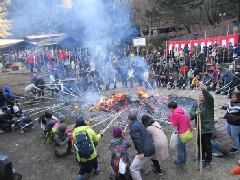夕やけ小やけふれあいの里の星ふる広場で、どんど焼きが行われます。ダルマやお飾り、書き初めなどがお焚き上げされます。竹串の先にまゆ玉(数に限りあり)をつけて、残り火で焼いて食べると、無病息災でいられると伝わります。