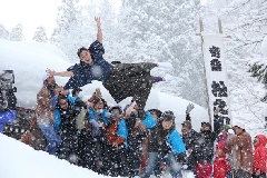 前年に結婚した婿を、薬師堂から5m程下の雪上へと投げるという荒っぽい行事が、松之山温泉で行われます。むこ投げ後は、賽の神を燃やした灰と雪を混ぜて墨を作り、「おめでとう」と言いながら、誰彼となくお互いの顔に塗りあいます。