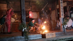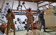浜松市に伝わる民俗芸能で、五穀豊穣などを祈って行われる「ひよんどり」が宝蔵寺観音堂で催されます。伝統的な舞型を受け継ぐ神楽系の舞楽の前段と、主に中世の面影を残す猿楽田楽系、田遊び系の演目を踊る後段で構成され、元亀元年(1570年)頃に始まったと言われます。なかでも日没後、クライマックスで披露される鬼の舞は、堂内で松明の火花が散るほどの豪快さで、最大の見どころとなっています。古くは「三日堂」、「おこない」、「鬼踊り」などとも呼ばれ、「ひよんどり」という現在の名称は、手に松明を持って踊る場面から「火踊り」がなまったものと考えられています。