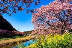 青野川沿い約2kmに植えられた河津桜800本が、例年2月上旬から3月上旬にかけて、見頃を迎えます。菜の花も楽しむことができる「みなみの桜と菜の花まつり」では、菜の花ドアや菜の花迷路などが設置され、大勢の人で賑わいます。ライトアップされた幻想的な夜桜を見ることもできます。