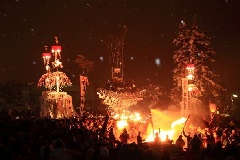 日本三大火祭りの一つとも言われる「野沢温泉の道祖神祭り」が、馬場の原で開催されます。13日に山からご神木が運ばれ、15日の昼までを費やし社殿が作られます。同日19時頃から火打ち石で採火した火をつけた松明が運ばれ、20時頃から火祭りが始まります。火をめぐる攻防戦は22時過ぎまで行われ、最後に社殿に火が入れられます。次第に大きくなる炎が空高く燃え上がると、祭りはクライマックスを迎えます。国の重要無形民俗文化財に指定されています。