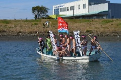元禄時代、この地に疫病が蔓延した際、疫病除けを祈願して始められたとされる、八王子神社の祭りです。もち米を入れた釜などを担いだ、ふんどし姿の男衆が、下太公民館を出立し、今之浦川までを練り歩きます。川に着くと、船に乗って米をとぎ、蒸して神前に供えます。その後、参拝者に分けられ、これを食べると、一年間、無病息災でいられると伝わります。磐田市の無形民俗文化財に指定されています。