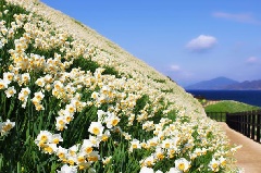 長崎半島の先端に位置する「長崎のもざき恐竜パーク」内の水仙の丘で、例年1月下旬から2月中旬にかけて、スイセンが開花します。まばゆい花景色の向こうには、海に浮かぶ世界文化遺産の軍艦島が望めます。スイセンの芳香と潮風のまざりあった独特の香りが印象的で、環境省の「かおり風景100選」に選ばれています。