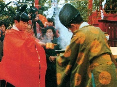大釜に金の湯を沸かし、除災招福、家内安全を祈念する「湯立神事」が御器所八幡宮で執り行われます。神事の後は、御神湯が参列者に配られます。参拝者はこの御神湯を家庭に持ち帰り、神棚にお供えして一年間の家内安全を祈ります。