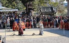 6世紀頃の創建とされる由緒ある古社、百舌鳥八幡宮で、歳旦祭が開催されます。氏子役員の奉仕による午前0時の初太鼓(大太鼓)を合図に、参詣者を迎えます。境内には、大阪府の天然記念物に指定されている樹齢約800年の巨大なクスノキが茂ります。