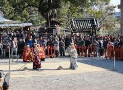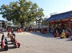 天下泰平と五穀豊穣を祈念し、大阪府弓道連盟により「古式弓道射初式」が、百舌鳥八幡宮へ奉納されます。境内の特設射場会場において、日置(へき)流の古式に則り、約60m離れた大的を弓で射ます。百舌鳥八幡宮は、6世紀頃の創建とされる由緒ある古社で、境内の樹齢約800年の巨大なクスノキは、大阪府の天然記念物に指定されています。