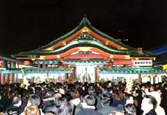 堀川戎神社の「十日戎」は、毎年1月9日から11日まで3日間夜通しで行われ、商売繁盛、福徳円満などを願う人々が吉兆を付けた福笹を求めて賑わいます。境内や参詣道は約500個におよぶ提灯で飾られ、周辺には200もの露店が立ち並びます。関西演芸協会のメンバーによる古典芸能の奉納(1月9日~11日の午前中)も行われます。