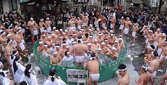 開運の神として知られる鐵砲洲稲荷神社で、毎年1月第2日曜に禊祓いの神事が行われます。約100人の褌(ふんどし)姿(女性は白装束)の人々が、宮司によるお祓いの後、入念な準備運動を行い、氷柱を入れた水槽に入って一年間の無病息災を願います。
