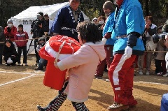 「力餅」は、本尊の初会式の行事として、毎年1月第3日曜に大山寺境内で行われます。男141kg、女70kg、小学生57kg、幼児17kgの餅をかかえ、歩いた距離を競います。見物する人も思わず力が入る名物行事です。「力餅」に先立ち、境内にて、柴燈大護摩供と火渡りが執り行われます。