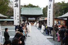 一年の終わりにあたり、知らず知らずのうちに犯した諸々の罪穢を祓い、心身ともに清々しい気持ちで新年を迎えるための儀式です。大祓式に引き続き、本殿にて一年の最後を締めくくる除夜祭が行われます。神様のご加護により、一年間無事に過ごすことができたことを感謝するとともに、国の平和と皇室、国民の平穏を祈ります。