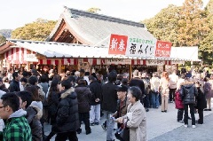あらゆる道の守護神として有名な宗像大社には、正月三が日に全国から約10万人が参拝に訪れます。1日に歳旦祭、3日に元始祭が執り行われます。おみくじに景品のついた名物「福みくじ」をはじめ、各種縁起物が揃います。