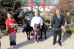 防府天満宮の節分祭では、神くじにより御神幸祭に供奉する神牛役を定めるという、全国的にも珍しい神事が行われます。牛を引き当てた人は、秋の御神幸祭で、神牛役として御網代輿にお供する役目が与えられます。金、銀、銅の牛の置物のほか数千点の寄贈景品が福運者に授けられることから、福運を占い願う参拝者で終日賑わいます。