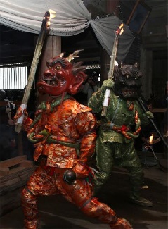 播州地方最古の古刹、増位山随願寺で750年の伝統をもつ修正会が営まれます。毘沙門天の化身の赤鬼、不動明王の化身の青鬼、薬師如来の化身の空鬼をはじめ、空鬼につく16の小鬼がホラ貝と鐘の音にあわせて踊りを披露します。山伏による採燈大護摩供養のほか、本尊薬師如来坐像等の特別公開もあります。地元団体による福引きなども催され、多くの人で賑わいます。