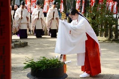 湊川神社の境内にある楠本稲荷神社で、初午祭が行われます。五穀豊穣や産業の発展を祈る祭典に引き続き、「湯立て神事」が斎行されます。巫女が釜で湧かした湯に笹束を浸し、周囲に振りまいて、罪や穢れを祓い、家内安全、商売繁盛、無病息災を祈ります。