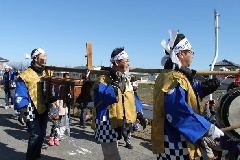 顔に墨を塗った大人や子どもが、人々に墨を塗りつけるユニークな祭が、上福島地区で行われます。江戸時代の元禄年間(1688~1704年)に疫病が流行した際、転んで鍋の炭が顔についた女性が病気にならなかったことから始まったとされます。埼玉県の玉敷神社から御神体と天狗の面を借り、この面をつけた「先達(せんだつ)」を先頭に、御神体を奉持した人、オサゴ櫃を担いだ人や太鼓を打ち鳴らす人、顔に墨を塗った人々が続きます。輪切りの大根につけた墨を顔につけられた人は、その年、風邪や悪病にかからず、無病息災で過ごせるとされます。