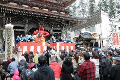 節分の日に、谷汲山華厳寺で厄除祈願会が執り行われ、無病息災と厄除の願いを込めた豆まきが開催されます。豆まきは御本堂、仁王門の順で催され、一般参拝者へも福豆が授与されます。仁王門には高さ4mの赤鬼像があり、股をくぐると厄払いになるとされ、訪れた多くの人が一年の無病息災を願い、赤鬼の股をくぐります。