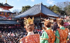 古くから伝わる中山寺の追儺式(一年の災いを払う儀式)は、宝塚歌劇団生扮する観音様に、貪(とん)、瞋(じん)、痴(ち)3匹の鬼が諭されて、福、禄、寿の善神に変わる様を音楽法要として現代風にアレンジしたもので、午後から2回行われます。宝塚歌劇団生を福娘、関西の各界で活躍している方々を福男として豆まき式も催されます。その年の当たり星をお祭りし、悪い年は悪事災難を免れるように、良い年は一層良くなるように祈祷する「節分開運星祭(星祭特別祈祷)」が斎行され、申込者には御札が授けられます。
