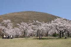 大室山の麓にある「さくらの里」では、例年3月下旬から4月上旬にかけてソメイヨシノ(染井吉野)が見頃を迎えます。「日本さくら名所100選」に選ばれている園内には、早咲きから遅咲きまで40種1000本が植栽され、例年9月中旬に咲くジュウガツザクラ(十月桜)から、5月に咲くケンロクエンキクザクラ(兼六園菊桜)まで、長期にわたり、さまざまな種類の桜が咲きます。