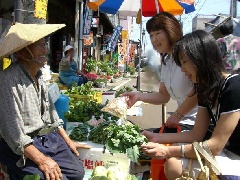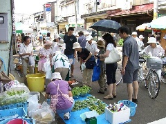 大町小学校をはさんで「二・七の市」と隣接し、4と9のつく日に開催される「四・九の市」は、大正9年(1920年)8月、当時の新須賀町から須賀町にかけて(現在の仲町2丁目付近)、町内の有志の発案で始まりました。現在では、雁木のまちなみとして知られる大町4丁目で開催されています。雁木は各家の軒先を出して歩道にした雪国独特の街づくりで、道行く人の歩行を楽にという温かな思いやりから生まれたものです。雁木の道沿いには、新鮮な野菜や果物を扱う店を中心に多くの露店が並びます。