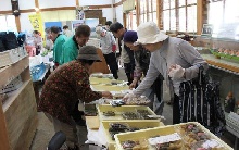 アミティ丹後で、毎週日曜に朝市が開催されます。水産物をはじめ、野菜や果物、花卉類のほか、加工食品や惣菜も販売されます。