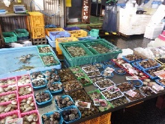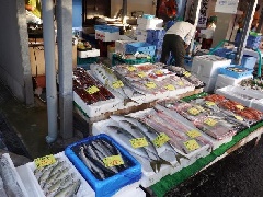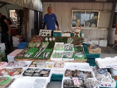 田尻漁協日曜朝市では、漁師の直売店をはじめ、魚屋や八百屋、てんぷらなどの総菜を販売する店など、バラエティに富んだ商品がずらりと並びます。年末は大売出しが開催され、目玉商品の活鯛やお正月商品を求める買い物客らで賑わいます。