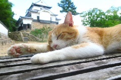 備中松山城では、推定11歳のオス猫の「猫城主さんじゅーろー」が、城のPRに一役買っています。備中松山藩の藩士から、新選組の七番隊組長になった谷三十郎にちなみ「さんじゅーろー」と名付けられました。その可愛らしさと人懐っこさから、観光客の人気となり、豪雨で落ち込んだ城の入城者数をV字回復させました。「さんじゅーろー」は、原則、城の管理事務所に常駐し、定期的に城内見回り(1日2回、10時と14時)を行っています。備中松山城に行くと、お仕事に励むかわいい「さんじゅーろー」に会えるかもしれません。