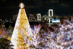 デックス東京ビーチでは、一年を通して楽しめる「お台場イルミネーション“YAKEI”」の点灯が行われています。東京湾の夜景とレインボーブリッジを背景に、高さ約20m、幅約10mの生木を使用した台場メモリアルツリーや、シーサイドテラスのメインオブジェ「ODAIBA」を中心とした光り輝く空間が広がり、芸術と癒しが一体となった居心地のよいアートスポットとなっています。