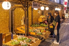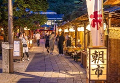 おかげ横丁で毎月1日(1月を除く)の早朝に、朝市が立ちます。各店では、月替わりの朝粥など、この日だけのメニューが並びます。伊勢には昔から月の初めに、いつもより早起きをし、無事に1か月を過ごせたことに感謝し、新しい月の無事をお祈りするために、神宮に参拝する「朔日参り」という風習があります。※朝市の時間帯は、公共交通機関の運行はないため、ご注意ください。