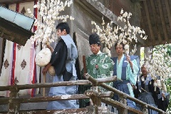 浦嶋伝説ゆかりの社として有名な浦嶋神社で、毎年3月17日に、長寿や延命息災、招福などを祈願する「延年祭」が行われます。別名「福棒祭」とも呼ばれ、くじで「福棒」を引き当てた人は願いが叶うとされており、縁起物を当てるためにくじを求める参拝客で賑わいます。祭の最後には、その年の五穀豊穣を願い、「翁三番叟」が奉納されます。華やかな衣裳を纏った狂言師がゆるやかに舞う姿は、見物客を幽玄の世界に誘います。