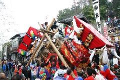 古来から漁業で栄えた幸崎能地(のうじ)で、豊漁を願う「幸崎能地春祭り」が盛大に催されます。1日目に御神体を乗せて常磐神社を出発した神輿が、町の氏神の幸崎神社でさらに御神体を迎え、二神体となってその夜の御旅所となる老婆(うばく)社で明かし、2日目に常磐神社に向かいます。5歳から8歳くらいの男の子が神童としてだんじりに乗り込んだり、獅子太鼓を奉納したりするのが特徴で、渡御する神輿を挟んで行われる4つのだんじりの練り合いや、要所要所に奉納される獅子太鼓が見どころとなっています。神童の乗っただんじりを若者たちが担ぎ、時には軒先を壊すほどの激しく迫力ある練り合いも見られます。県指定無形民俗文化財。
