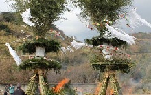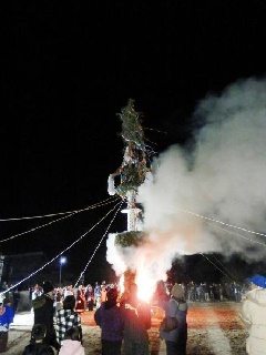 柳井市の半島部にあたる阿月地区で、毎年2月11日に、国の重要無形民俗文化財に指定されている壮大な火祭が行われます。早朝から身を清めた白装束の若者たちが、酒樽に棒をかけ、それを担いで練り歩き、法螺貝の合図で高さ20mの御神体を起し立てます。この「起し立て」と、最後に御神体に火が放たれる様子は堂々たるもので、観客を圧倒します。御神体のまわりでは、昼夜2回「神明踊り」が奉納され、刀や槍を巧みに使った武者踊りが披露されます。